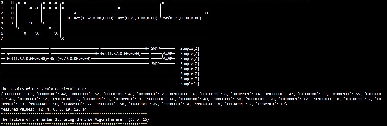 Results of using Shor's algorithm with the Pyquil interpreter to factorize the number 15.